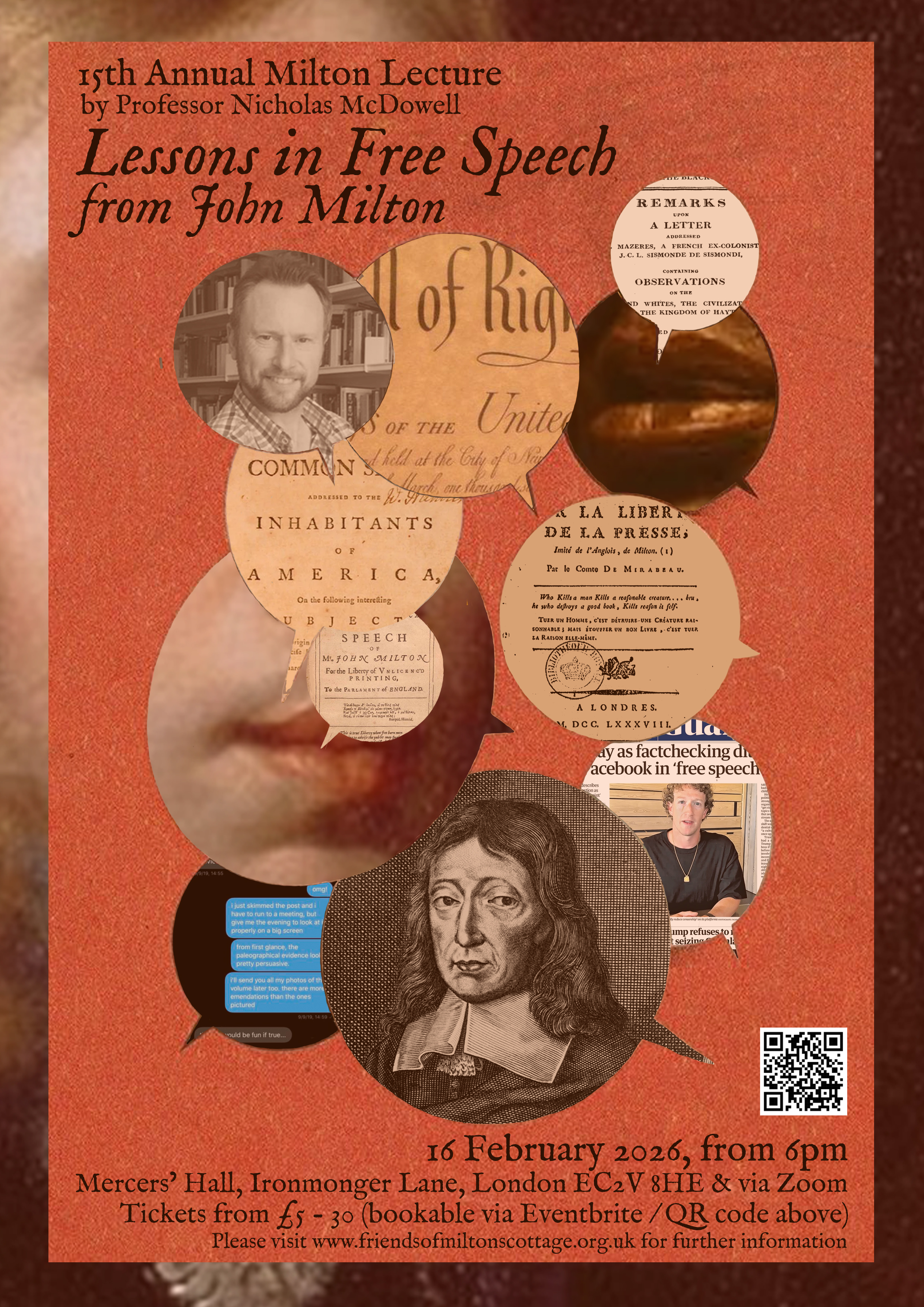 The Friends of Milton's Cottage are delighted to invite you to this year's Annual Milton Lecture, which will take place at Mercers' Hall on Monday 16 February from 6pm GMT.