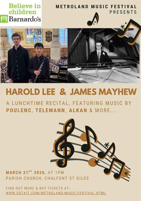 Do come and support this duo of whom the pianist, James lives in Chalfont St Giles . He is currently studying at the Royal Academy of music