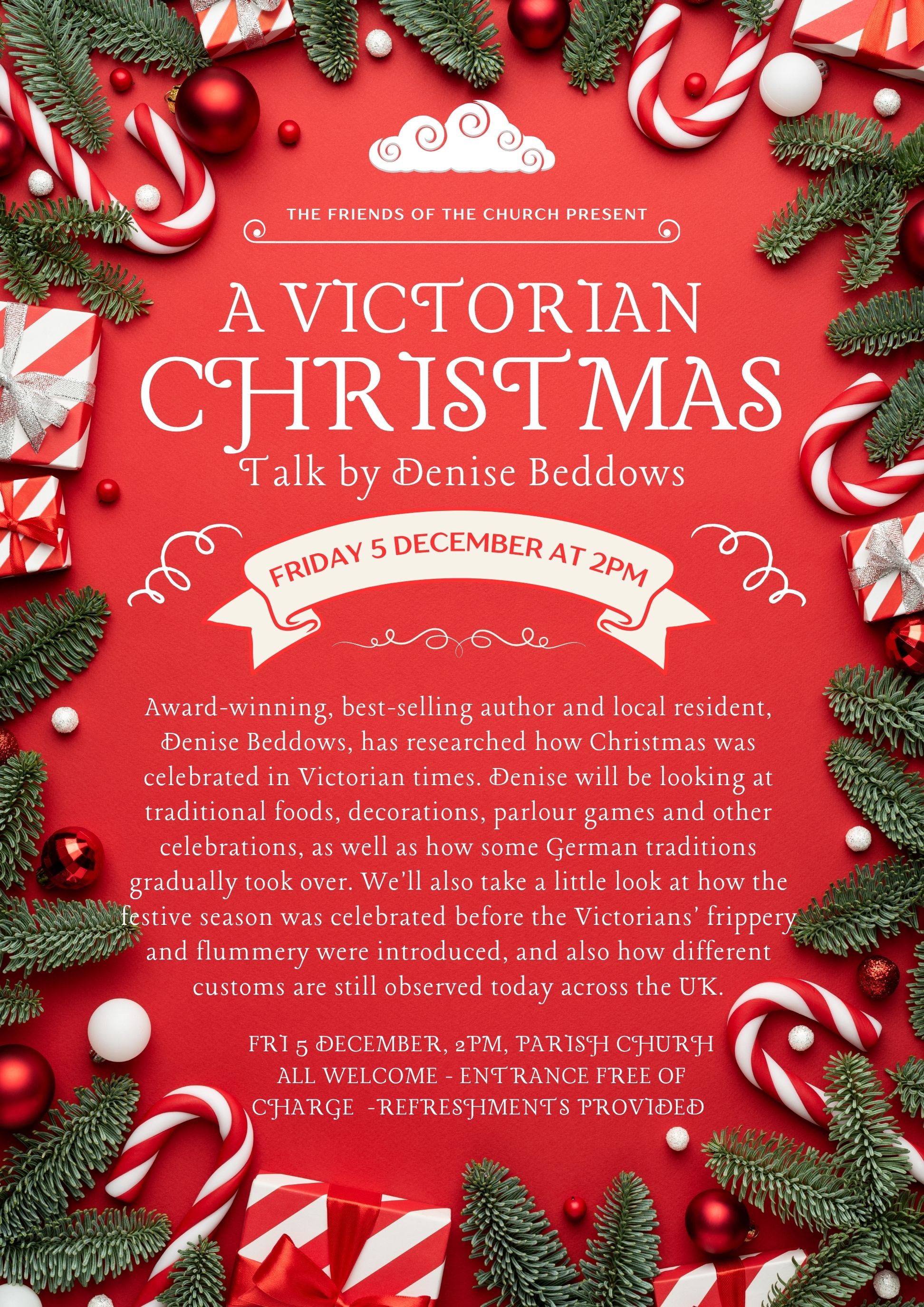 We are pleased to welcome local author, Denise Beddows, to give an illustrated talk about Christmas in the Victorian times. Denise will also touch on traditions that pre-dated this period, as well as many of the Victorian (and German) customs that we still enjoy today. The talk will take place at 2pm on Friday 5 December in Chalfont St Giles Parish Church and will be followed by tea and mince pies. There is no charge for the talk and all are welcome. As always, any and all donations will be greatly appreciated. Denise is founder of the hugely successful Chiltern Kills Crime Festival in Gerrards Cross, and an active supporter of Chalfont St Giles & Jordans Literary Festival. She held a senior position in government for many years, with a background in research, investigation and intelligence analysis which saw her work and live in over 20 countries. During this time she was tear-gassed, mortar-bombed, held-up at gunpoint by sky marshalls and briefly taken hostage. Now writing from the much quieter environment of her home in the Chalfonts, she has published numerous crime and espionage novels, and true crime. Her books regularly sit in Amazon’s top five best sellers and is widely celebrated in professional awards ceremonies. We are honoured and grateful that Denise has generously agreed to give this talk for our enjoyment and as a fundraiser to support the Friends of the Church charity.